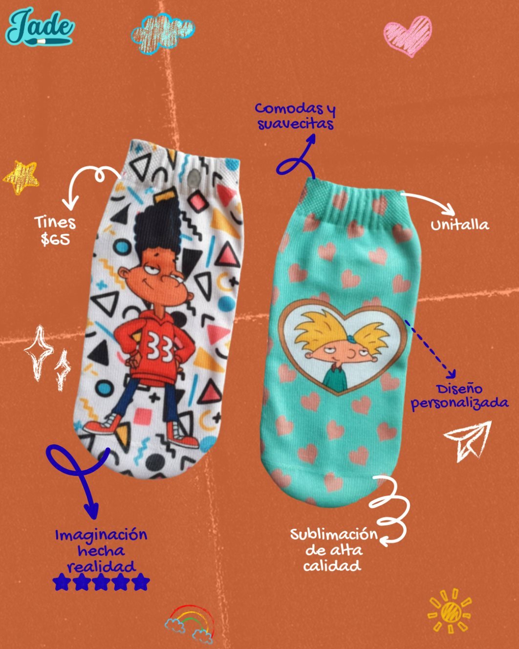 Exprésate con estilo único gracias a nuestras opciones de personalización. Transforma tus calcetas o tines en verdaderas obras de arte usando imágenes de tu caricatura, anime, película o personaje favorito. Cada diseño es cuidadosamente impreso utilizando impresiones por transferencia y tecnología DTF (Direct to Film), que asegura colores vivos y detalles precisos que no se desvanecen con el uso.